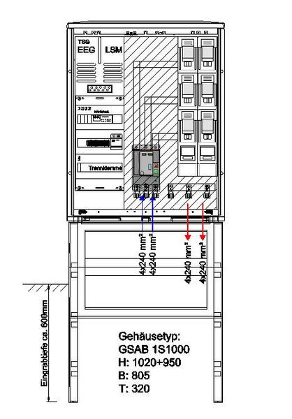 | Kurzbeschreibung | NA-Schutzschrank Gr.1 ohne Sockel HxBxT:1000x805x320 nach VDE-AR-N 4105, 250kW |