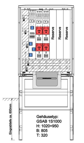 | Kurzbeschreibung | Festplatzverteiler HxBxT:1000x805x320 mit Sammelsch. 400A, 5-pol,Sys-32+16+Schuko |