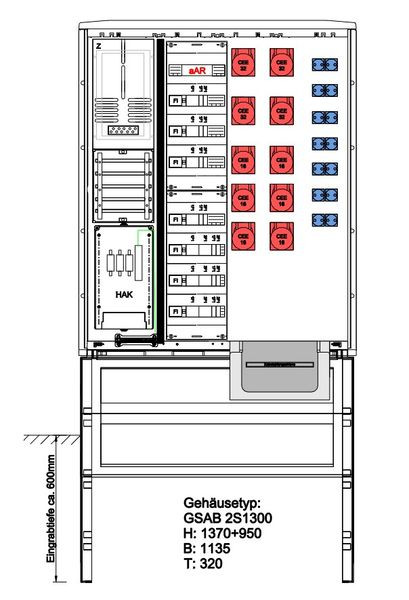 | Kurzbeschreibung | Festplatzverteiler mit VNB-Teil, bestückt mit 4xCEE32+6xCEE16,14xSchuko, mit FP-Einf |