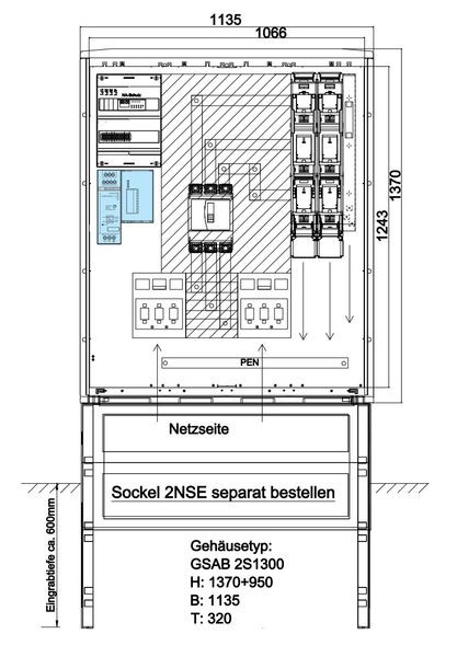 | Kurzbeschreibung | NA-Schutzschrank für Außen HxBxT:1300x1135x320 nach VDE-AR-N 4105, 260kW |