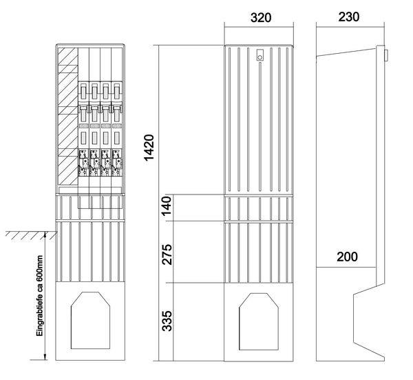 | Kurzbeschreibung | Verteilersäule mit Sockel HxBxT:1420x320x234, mit Sammelschiene 185mm+4xNH00 Lastschaltleiste |