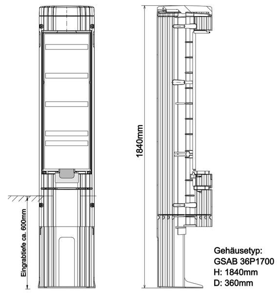 | Kurzbeschreibung | GSAB-Poller rund m. Sockel, Höhe 1811mm, Durchm. 360mm mit 5-pol. Sammelsch. 30x5 (185mm) +FP-Einf |