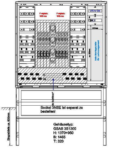 | Kurzbeschreibung | Verteilerschrank für Emobility H:1370 x B:1465 x T:320mm für 16x22KW Abgänge |