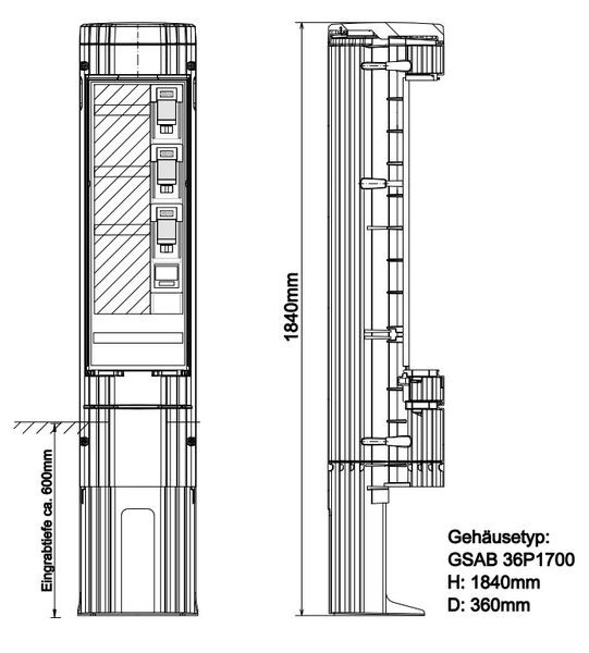 | Kurzbeschreibung | GSAB-Poller, Höhe 1811mm, Durchm. 360mm mit Sammelsch. 30x5 (185mm), 1x NH2-Lastschaltleiste |