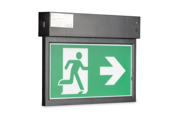 Moderne, unauffällige und ästhetische Rettungszeichenleuchte Unlimited, im Polycarbonatgehäuse in Verkehrsschwarz, RAL 9017. Dank Universalmontage, ohne weiteres Zubehör, an Wand oder Decke montierbar. Sie bestimmen (auch noch vor Ort), wo die Leuchte befestigt wird. Ohne Werkzeug einrastbares Leuchtenmodul, vollständig mit allen elektrischen Betriebs- und Leuchtmitteln, zur schnellen und einfachen Installation.