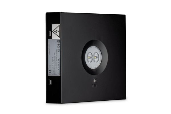 Quadratische Sicherheitsleuchte in minimalistischem Design. Anschluss- und montagefreundliches Kunststoffgehäuse in Verkehrsschwarz, RAL 9017.