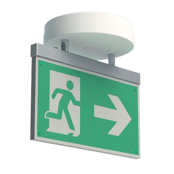 Multifunktionale und universelle Rettungszeichenleuchte mit lichttechnisch optimierter Acrylglasscheibe im Aluminiumprofil, mit hochwertiger Pulverbeschichtung in reinweiß (RAL 9010), zur Deckenmontage. Mit 2 Metallpendeln zur Abrundung der edlen Optik. Elektronikgehäuse aus temperatur- und farbbeständigem Kunststoff. Lieferung inklusive Zubehör zur Ein- oder Aufbaumontage bzw. wahlweise zum Einbau in Installationsdosen. Optional erhältliches Zubehör zur Umrüstung auf Pendel-, Seil- oder Wandauslegermontage.