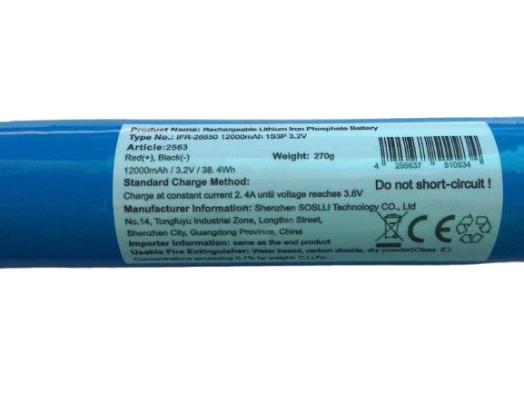 Kurzbeschreibung SL-LDC-P-61403 - LiFePO4-Akkupack | 3,2V / 12Ah | 200 x 32mm | inkl. Anschlusskabel | Typ: IFR-26650 | Anzahl Zellen: 3