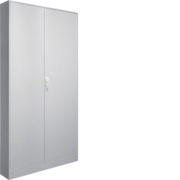 Einzelstandverteiler für Innenraummontage, entspricht DIN EN 61439 und DIN 43870. Niederspannungsverteilung bis 400 A, 3AC 230/400 V, 50 Hz. Schutzart IP44, Schutzklasse I. Gehäuse aus 1 mm Stahlblech, pulverbeschichtet, Innenauskleidung Kunststoff. Maße: 1950x1050x205 mm. Features: abfangende waagerechte Schiene, Tür mit Dreipunktschließung, anflanschbar, Sockelleiste mit abnehmbarer Front.