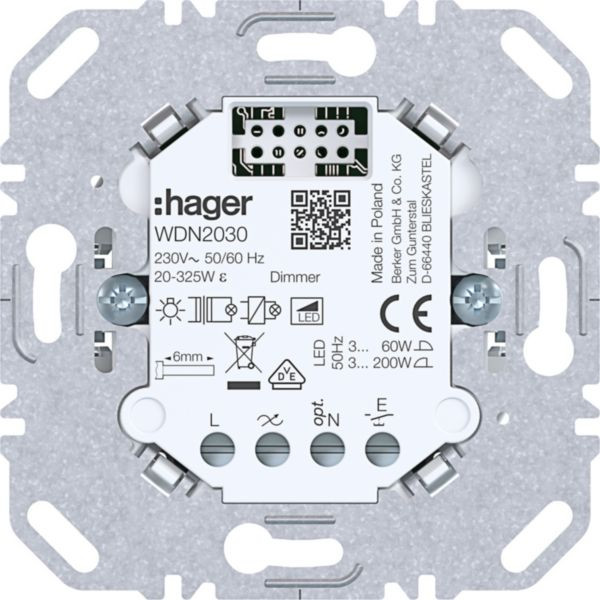 Der Universal-Tastdimmer unterstützt Phasenan- oder Phasenabschnittssteuerung und ist geeignet für 230 Volt LED- und Energiesparlampen. Er verfügt über eine automatische Einstellung der minimalen Starthelligkeit, einen lampenschonenden Softanlauf und ist selbstlernend. Kurzschlusssicher und überlastsicher durch elektronische Sicherung. Die Montage erfolgt mittels Schraubklemmen, ohne leitende Verbindung zwischen Tragring und Spreizkrallen.