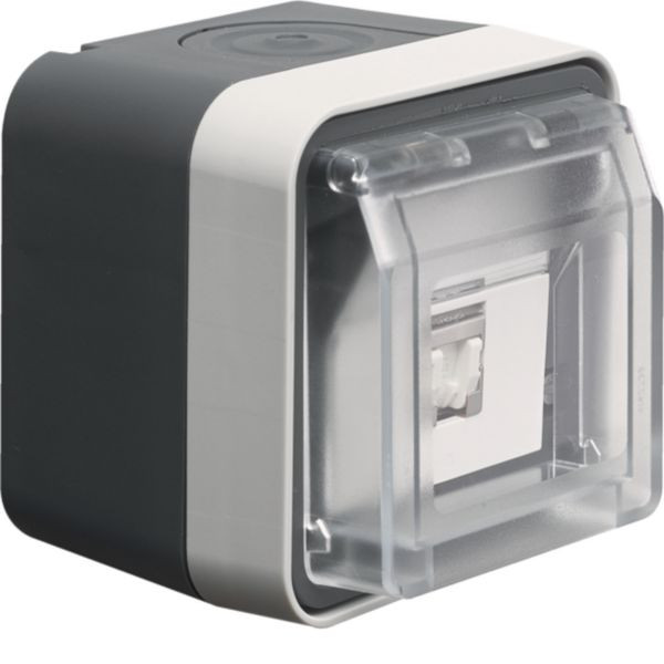 UAE-Steckdose, 8-polig, geschirmt, Kategorie 6, Aufputz, IP Standard 55, geeignet für RJ45-Stecker und PoE+. Ausgestattet mit 2 Leitungseinführungen, 360° Schirmkontaktierung, LSA+ Klemmen und vollflächiger Dichtung. Der Klappdeckel ist transparent und zufallend, um den Schutzgrad IP55 sicherzustellen. Einfache Montage durch Bajonett-Schnellverschluss. Ideal für anspruchsvolle Netzwerkinstallationen.