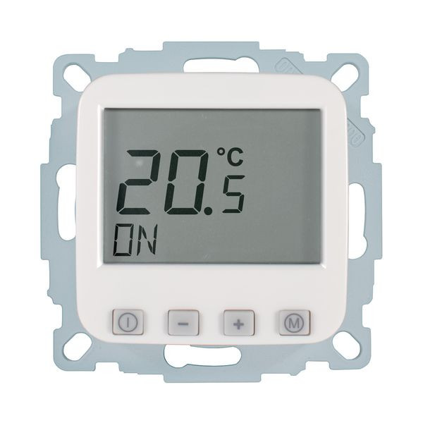 Raumtemperaturregler u.P. Digital, zur Regelung der Raumtemperatur und gleichzeitiger Begrenzung der Fußbodentemperatur, ohne Zeitschaltuhr, großes, beleuchtetes Display, einschl. Zentralscheibe, ohne Abdeckrahmen, einfache Bedienung, Ist- und Solltemperaturanzeige, 10(4)A, 230V, einschl. Fühler (NTC, 33kOhm bei 25°C) mit 4,00 m Leitung, ohne Fühlerhülse, Umstellmöglichkeit auf Heizen/Kühlen-Funktion und auf Schließerkontakt, Farbe: reinweiß glänzend, ähnlich RAL9010, passend in folgendes Schalterprogramm: Busch-Jaeger Reflex SI, SI Linear