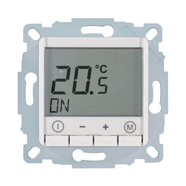 Raumtemperaturregler u.P. Digital, zur Regelung der Raumtemperatur und gleichzeitiger Begrenzung der Fußbodentemperatur, ohne Zeitschaltuhr, großes, beleuchtetes Display, einschl. Zentralscheibe 50x50mm, ohne Abdeckrahmen, einfache Bedienung, Ist- und Solltemperaturanzeige, 10(4)A, 230V, einschl. Fühler (NTC, 33kOhm bei 25°C) mit 4,00 m Leitung, ohne Fühlerhülse, Umstellmöglichkeit auf Heizen/Kühlen-Funktion und auf Schließerkontakt, Farbe: reinweiß glänzend, ähnlich RAL9010, passend in nahezu alle Schalterprogramme mittels Zwischenrahmen 50x50mm (nicht im Lieferumfang enthalten)