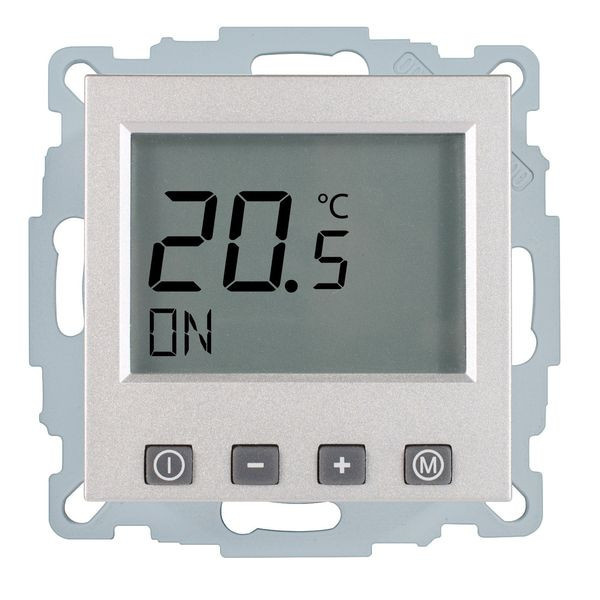 Raumtemperaturregler u.P. Digital, zur Regelung der Raumtemperatur und gleichzeitiger Begrenzung der Fußbodentemperatur, ohne Zeitschaltuhr, großes, beleuchtetes Display, einschl. Zentralscheibe, ohne Abdeckrahmen, einfache Bedienung, Ist- und Solltemperaturanzeige, 10(4)A, 230V, einschl. Fühler (NTC, 33kOhm bei 25°C) mit 4,00 m Leitung, ohne Fühlerhülse, Umstellmöglichkeit auf Heizen/Kühlen-Funktion und auf Schließerkontakt, Farbe: alu glänzend (lackiert), passend in folgende Schalterprogramme: Jung Serie A, Merten Serie System M