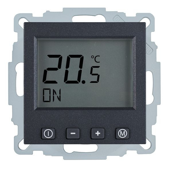 Raumtemperaturregler u.P. Digital, zur Regelung der Raumtemperatur und gleichzeitiger Begrenzung der Fußbodentemperatur, ohne Zeitschaltuhr, großes, beleuchtetes Display, einschl. Zentralscheibe, ohne Abdeckrahmen, einfache Bedienung, Ist- und Solltemperaturanzeige, 10(4)A, 230V, einschl. Fühler (NTC, 33kOhm bei 25°C) mit 4,00 m Leitung, ohne Fühlerhülse, Umstellmöglichkeit auf Heizen/Kühlen-Funktion und auf Schließerkontakt, Farbe: anthrazit matt (lackiert), passend in folgendes Schalterprogramm: Jung Serie A