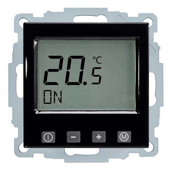 Raumtemperaturregler u.P. Digital, zur Regelung der Raumtemperatur und gleichzeitiger Begrenzung der Fußbodentemperatur, ohne Zeitschaltuhr, großes, beleuchtetes Display, einschl. Zentralscheibe 55x55, ohne Abdeckrahmen, einfache Bedienung, Ist- und Solltemperaturanzeige, 10(4)A, 230V, einschl. Fühler (NTC, 33kOhm bei 25°C) mit 4,00 m Leitung, ohne Fühlerhülse, Umstellmöglichkeit auf Heizen/Kühlen-Funktion und auf Schließerkontakt, Farbe: schwarz glänzend, passend in folgendes Schalterprogramm: Jung Serie A und AS