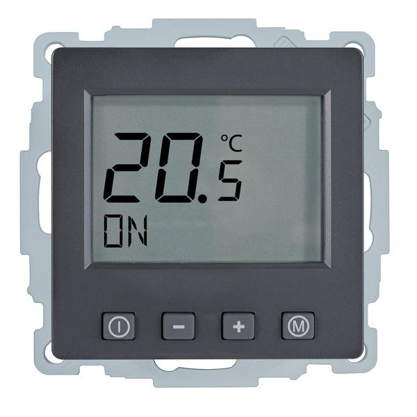 Raumtemperaturregler u.P. Digital, zur Regelung der Raumtemperatur und gleichzeitiger Begrenzung der Fußbodentemperatur, ohne Zeitschaltuhr, großes, beleuchtetes Display, einschl. Zentralscheibe, einfache Bedienung, Ist- und Solltemperaturanzeige, 10(4)A, 230V, einschl. Fühler (NTC, 33kOhm bei 25°C) mit 4,00 m Leitung, ohne Fühlerhülse, Umstellmöglichkeit auf Heizen/Kühlen-Funktion und auf Schließerkontakt, Farbe: anthrazit samt lackiert, passend in folgende Schalterprogramme: Berker Q.1, Q.3, Q.7
