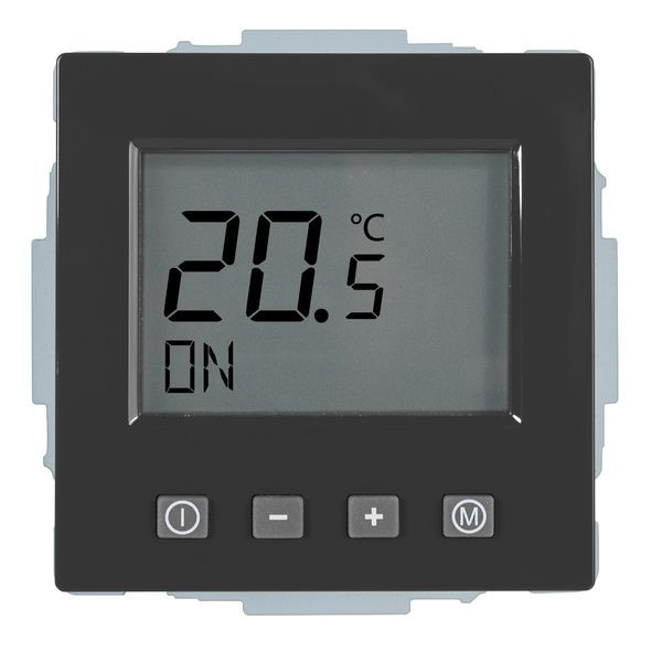 Raumtemperaturregler u.P. Digital, zur Regelung der Raumtemperatur und gleichzeitiger Begrenzung der Fußbodentemperatur, ohne Zeitschaltuhr, großes, beleuchtetes Display, einschl. Zentralscheibe, ohne Abdeckrahmen, einfache Bedienung, Ist- und Solltemperaturanzeige, 10(4)A, 230V, einschl. Fühler (NTC, 33kOhm bei 25°C) mit 4,00 m Leitung, ohne Fühlerhülse, Umstellmöglichkeit auf Heizen/Kühlen-Funktion und auf Schließerkontakt, Farbe: anthrazit glänzend, passend für folgende Schalterprogramme: Busch-Jaeger future, future-linear, solo, axcent, carat, dynasty und pur edelstahl