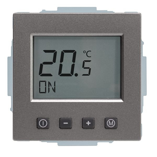 Raumtemperaturregler u.P. Digital, zur Regelung der Raumtemperatur und gleichzeitiger Begrenzung der Fußbodentemperatur, ohne Zeitschaltuhr, großes, beleuchtetes Display, einschl. Zentralscheibe, ohne Abdeckrahmen, einfache Bedienung, Ist- und Solltemperaturanzeige, 10(4)A, 230V, einschl. Fühler (NTC, 33kOhm bei 25°C) mit 4,00 m Leitung, ohne Fühlerhülse, Umstellmöglichkeit auf Heizen/Kühlen-Funktion und auf Schließerkontakt, Farbe: graumetallic (lackiert), passend in folgende Schalterprogramme: Busch-Jaeger future, future-linear, solo, axcent, carat, dynasty und pur edelstahl