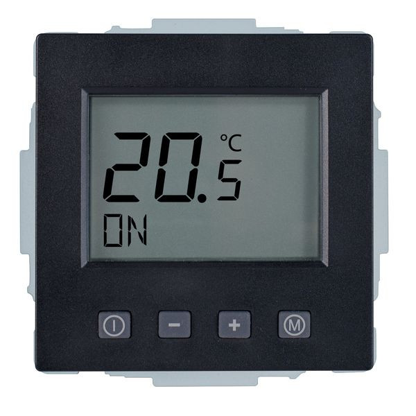 Raumtemperaturregler u.P. Digital, zur Regelung der Raumtemperatur und gleichzeitiger Begrenzung der Fußbodentemperatur, ohne Zeitschaltuhr, großes, beleuchtetes Display, einschl. Zentralscheibe, ohne Abdeckrahmen, einfache Bedienung, Ist- und Solltemperaturanzeige, 10(4)A, 230V, einschl. Fühler (NTC, 33kOhm bei 25°C) mit 4,00 m Leitung, ohne Fühlerhülse, Umstellmöglichkeit auf Heizen/Kühlen-Funktion und auf Schließerkontakt, Farbe: schwarz matt, passend in folgende Schalterprogramme: Busch-Jaeger future, future-linear, solo, axcent, carat, dynasty und pur edelstahl