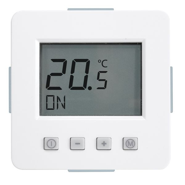 Raumtemperaturregler u.P. Digital, zur Regelung der Raumtemperatur und gleichzeitiger Begrenzung der Fußbodentemperatur, ohne Zeitschaltuhr, großes, beleuchtetes Display, einschl. Zentralscheibe, ohne Abdeckrahmen, einfache Bedienung, Ist- und Solltemperaturanzeige, 10(4)A, 230V, einschl. Fühler (NTC, 33kOhm bei 25°C) mit 4,00 m Leitung, ohne Fühlerhülse, Umstellmöglichkeit auf Heizen/Kühlen-Funktion und auf Schließerkontakt, Farbe: alpinweiß glänzend, ähnlich RAL9010, passend in folgendes Schalterprogramm: Jung Serie CD 500, CD plus, CD 500 Aufputz