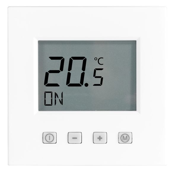 Raumtemperaturregler u.P. Digital, zur Regelung der Raumtemperatur und gleichzeitiger Begrenzung der Fußbodentemperatur, ohne Zeitschaltuhr, großes, beleuchtetes Display, einschl. Zentralscheibe, ohne Abdeckrahmen, einfache Bedienung, Ist- und Solltemperaturanzeige, 10(4)A, 230V, einschl. Fühler (NTC, 33kOhm bei 25°C) mit 4,00 m Leitung, ohne Fühlerhülse, Umstellmöglichkeit auf Heizen/Kühlen-Funktion und auf Schließerkontakt, Farbe: lotusweiß glänzend, ähnlich RAL9003, passend in folgendes Schalterprogramm: Merten D-Life