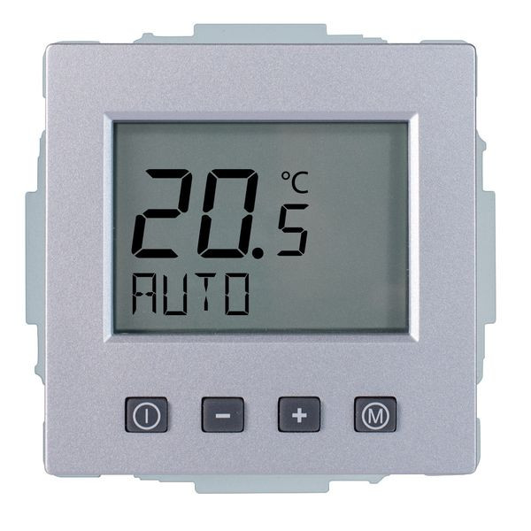 Raumtemperaturregler u.P. Komfort, zur Regelung der Raumtemperatur und gleichzeitiger Begrenzung der Fußbodentemperatur, mit Zeitschaltuhr, großes, beleuchtetes Display, einschl. Zentralscheibe, ohne Abdeckrahmen, einfache Bedienung, Ist- und Solltemperaturanzeige, 10(4)A, 230V, einschl. Fühler (NTC, 33kOhm bei 25°C) mit 4,00 m Leitung, ohne Fühlerhülse, Umstellmöglichkeit auf Heizen/Kühlen-Funktion und auf Schließerkontakt, selbstlernendes Regelverhalten, Farbe: alu glänzend (lackiert), passend in folgende Schalterprogramme: Busch-Jaeger future, future-linear, solo, axcent, carat, dynasty und pur edelstahl
