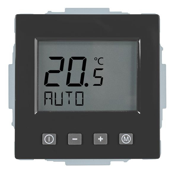 Raumtemperaturregler u.P. Komfort, zur Regelung der Raumtemperatur und gleichzeitiger Begrenzung der Fußbodentemperatur, mit Zeitschaltuhr, großes, beleuchtetes Display, einschl. Zentralscheibe, ohne Abdeckrahmen, einfache Bedienung, Ist- und Solltemperaturanzeige, 10(4)A, 230V, einschl. Fühler (NTC, 33kOhm bei 25°C) mit 4,00 m Leitung, ohne Fühlerhülse, Umstellmöglichkeit auf Heizen/Kühlen-Funktion und auf Schließerkontakt, selbstlernendes Regelverhalten, Farbe: anthrazit glänzend, passend für folgende Schalterprogramme: Busch-Jaeger future, future-linear, solo, axcent, carat, dynasty und pur edelstahl