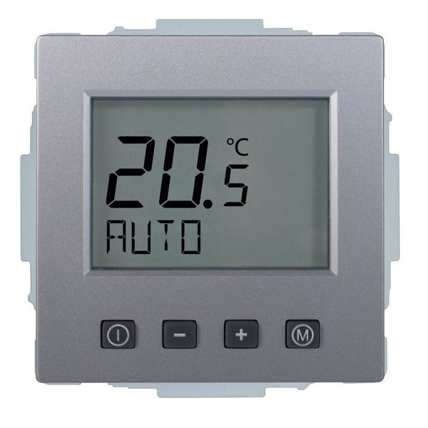 Raumtemperaturregler u.P. Komfort, zur Regelung der Raumtemperatur und gleichzeitiger Begrenzung der Fußbodentemperatur, mit Zeitschaltuhr, großes, beleuchtetes Display, einschl. Zentralscheibe, ohne Abdeckrahmen, einfache Bedienung, Ist- und Solltemperaturanzeige, 10(4)A, 230V, einschl. Fühler (NTC, 33kOhm bei 25°C) mit 4,00 m Leitung, ohne Fühlerhülse, Umstellmöglichkeit auf Heizen/Kühlen-Funktion und auf Schließerkontakt, selbstlernendes Regelverhalten, Farbe: edelstahlfarbig (lackiert), passend in folgende Schalterprogramme: Busch-Jaeger future, future-linear, solo, axcent, carat, dynasty und pur edelstahl