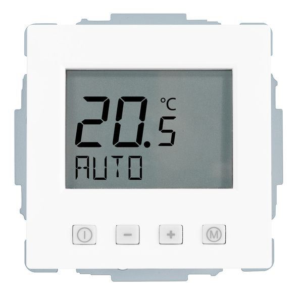 Raumtemperaturregler u.P. Komfort, zur Regelung der Raumtemperatur und gleichzeitiger Begrenzung der Fußbodentemperatur, mit Zeitschaltuhr, großes, beleuchtetes Display, einschl. Zentralscheibe, ohne Abdeckrahmen, einfache Bedienung, Ist- und Solltemperaturanzeige, 10(4)A, 230V, einschl. Fühler (NTC, 33kOhm bei 25°C) mit 4,00 m Leitung, ohne Fühlerhülse, Umstellmöglichkeit auf Heizen/Kühlen-Funktion und auf Schließerkontakt, selbstlernendes Regelverhalten, Farbe: studioweiß matt, ähnlich RAL9016, passend in folgende Schalterprogramme: Busch-Jaeger future, future-linear, solo, axcent, carat, dynasty und pur edelstahl