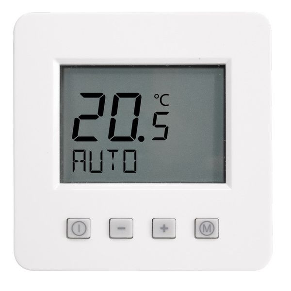 Raumtemperaturregler u.P. Komfort, zur Regelung der Raumtemperatur und gleichzeitiger Begrenzung der Fußbodentemperatur, mit Zeitschaltuhr, großes, beleuchtetes Display, einschl. Zentralscheibe, ohne Abdeckrahmen, einfache Bedienung, Ist- und Solltemperaturanzeige, 10(4)A, 230V, einschl. Fühler (NTC, 33kOhm bei 25°C) mit 4,00 m Leitung, ohne Fühlerhülse, Umstellmöglichkeit auf Heizen/Kühlen-Funktion und auf Schließerkontakt, selbstlernendes Regelverhalten, Farbe: alpinweiß glänzend, ähnlich RAL9010, passend in folgendes Schalterprogramm: Jung Serie CD 500, CD plus, CD 500 Aufputz