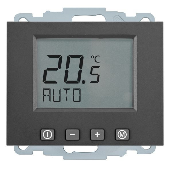 Raumtemperaturregler u.P. Komfort, zur Regelung der Raumtemperatur und gleichzeitiger Begrenzung der Fußbodentemperatur, mit Zeitschaltuhr, großes, beleuchtetes Display, einschl. Zentralscheibe, ohne Abdeckrahmen, einfache Bedienung, Ist- und Solltemperaturanzeige, 10(4)A, 230V, einschl. Fühler (NTC, 33kOhm bei 25°C) mit 4,00 m Leitung, ohne Fühlerhülse, Umstellmöglichkeit auf Heizen/Kühlen-Funktion und auf Schließerkontakt, selbstlernendes Regelverhalten, Farbe: anthrazit samt, passend in folgendes Schalterprogramm: Berker Serie K.1, K.5