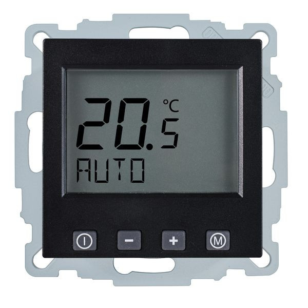 Raumtemperaturregler u.P. Komfort, mit Zeitschaltuhr, großes, beleuchtetes Display, einschl. Zentralscheibe, ohne Abdeckrahmen, einfache Bedienung, Ist- und Solltemperaturanzeige, 10(4)A, 230V, Pumpenschutzfunktion, Umstellmöglichkeit auf Heizen/Kühlen-Funktion und auf Schließerkontakt, für Stellantriebe stromlos geschlossen und stromlos offen, selbstlernendes Regelverhalten, Farbe: schwarz/graphitschwarz matt (lackiert), passend in folgende Schalterprogramme: Gira System 55, Jung Serie A und AS, Merten Serie System M, Busch-Jaeger Serie Balance SI