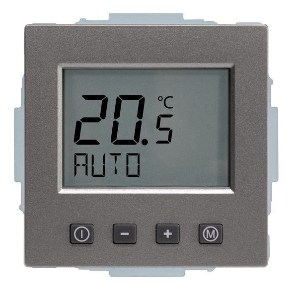 Raumtemperaturregler u.P. Komfort, mit Zeitschaltuhr, großes, beleuchtetes Display, einschl. Zentralscheibe, ohne Abdeckrahmen, einfache Bedienung, Ist- und Solltemperaturanzeige, 10(4)A, 230V, Pumpenschutzfunktion, Umstellmöglichkeit auf Heizen/Kühlen-Funktion und auf Schließerkontakt, für Stellantriebe stromlos geschlossen und stromlos offen, selbstlernendes Regelverhalten, Farbe: graumetallic (lackiert), passend in folgende Schalterprogramme: Busch-Jaeger future, future-linear, solo, axcent, carat, dynasty und pur edelstahl