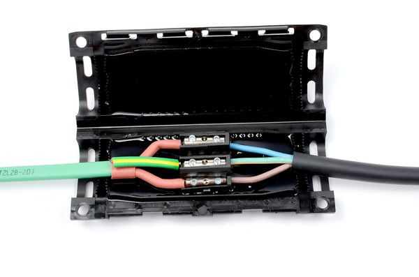 Heizbandanschluss- und Endabschlussgarnitur, Gelanschlusstechnik (Kaltanschlusstechnik), für selbstlimitierende Heizbänder, einschl. 2,00m Anschlussleitung, Betriebsspannung 230V, Schutzart IP66 (nicht für die Verlegung in der Dachrinne zugelassen), temperaturbeständig -25…+80°C (Anschlusstechnik), +60°C (Anschlussleitung)