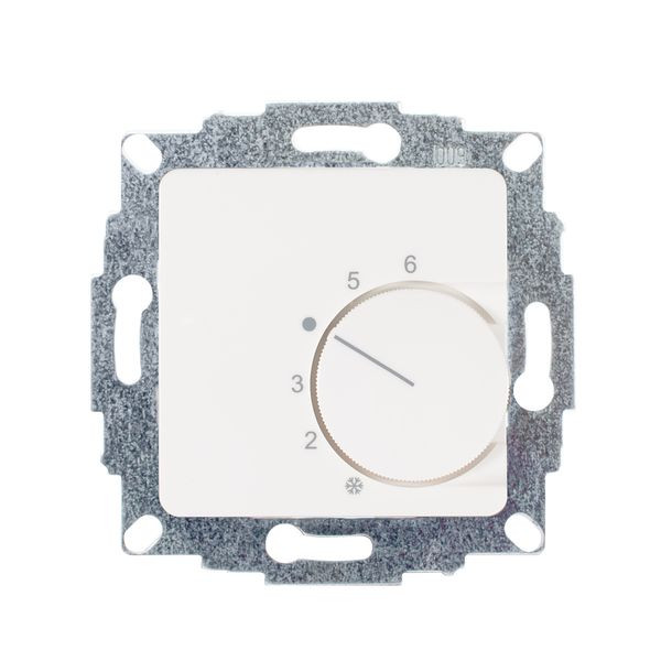 Raumtemperaturregler u.P., 230 V, einschl. Zentralscheibe 50x50mm, ohne Abdeckrahmen, Wechslerkontakt 10(4)A Heizen, 5(2)A Kühlen, für Stellantriebe stromlos geschlossen und stromlos offen, Einstellbereich 5…30°C mit Bereichseinengung, Temperaturabsenkung, Berührungsschutzkappe, Farbe: reinweiß glänzend, ähnlich RAL9010, passend in nahezu alle Schalterprogramme mittels Zwischenrahmen 50x50mm (nicht im Lieferumfang enthalten)