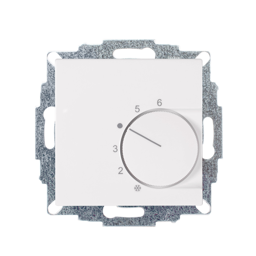 Raumtemperaturregler u.P., 230 V, einschl. Zentralscheibe, ohne Abdeckrahmen, für Stellantriebe "stromlos offen" und "stromlos geschlossen", Triac-Ausgang für max. 5 Stellantriebe (3W elektromechanisch), mit TA-Eingang (3,5°C), Einstellbereich 5…30°C mit Bereichseinengung, mit Berührungsschutzkappe, Anschluss für 230V-Eingangssignal "Heizen/Kühlen" (Change Over) vom gleichen FI und LS, ohne LED, Farbe: ultraweiß glänzend, ähnlich RAL9003, passend in folgendes Schalterprogramm: legrand SEANO Maximale Leitungslänge für Heizen/Kühlen-Eingang: 100 m. Im Falle größerer Leitungslängen ist u.U. ein Entstör-Kondensator 0,33 Mikrofarad zwischen Steuerleitung „Heizen/Kühlen“ und Neutralleiter erforderlich.