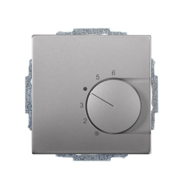 Raumtemperaturregler u.P., 230 V, einschl. Zentralscheibe, ohne Abdeckrahmen, für Stellantriebe stromlos offen und stromlos geschlossen, Triac-Ausgang für max. 5 Stellantriebe (3W elektromechanisch), ohne TA-Eingang, Einstellbereich 5…30°C mit Bereichseinengung, mit Berührungsschutzkappe, Farbe: edelstahlfarbig lackiert, passend in folgende Schalterprogramme: Busch-Jaeger future, future-linear, solo, axcent, carat, dynasty und pur edelstahl