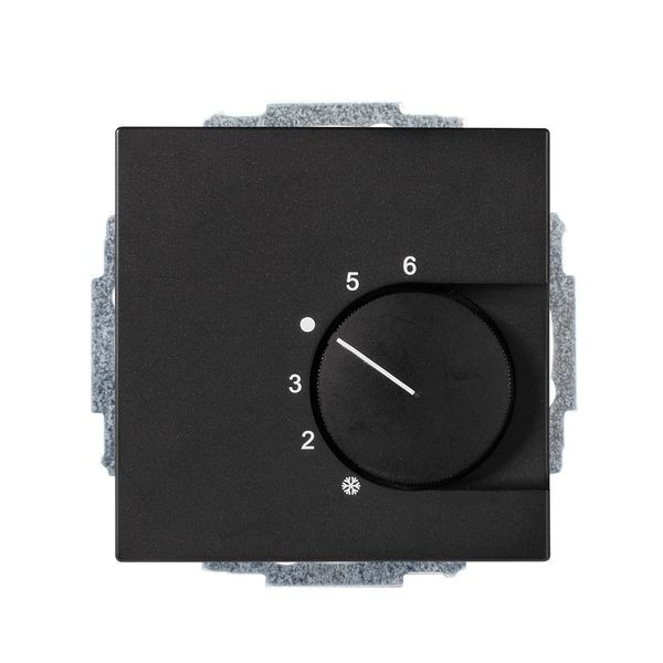 Raumtemperaturregler u.P., 230 V, einschl. Zentralscheibe, ohne Abdeckrahmen, für Stellantriebe stromlos offen und stromlos geschlossen, Triac-Ausgang für max. 5 Stellantriebe (3W elektromechanisch), ohne TA-Eingang, Einstellbereich 5…30°C mit Bereichseinengung, mit Berührungsschutzkappe, Farbe: schwarz matt, passend in folgende Schalterprogramme: Busch-Jaeger future, future-linear, solo, axcent, carat, dynasty und pur edelstahl