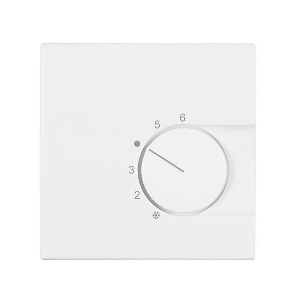 Raumtemperaturregler u.P., 230 V, einschl. Zentralscheibe, ohne Abdeckrahmen, für Stellantriebe stromlos offen und stromlos geschlossen, Triac-Ausgang für max. 5 Stellantriebe (3W elektromechanisch), ohne TA-Eingang, Einstellbereich 5…30°C mit Bereichseinengung, mit Berührungsschutzkappe, Farbe: reinweiß (schneeweiß) matt lackiert, ähnlich RAL9010, passend in folgende Schalterprogramme: Jung Serie LS