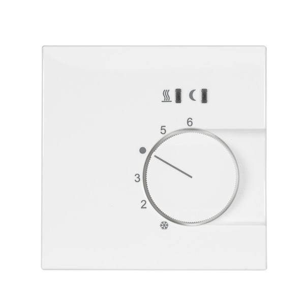 Raumtemperaturregler u.P., 230 V, einschl. Zentralscheibe, ohne Abdeckrahmen, für Stellantriebe stromlos offen und stromlos geschlossen, Triac-Ausgang für max. 5 Stellantriebe (3W elektromechanisch), mit TA-Eingang (3,5°C), Einstellbereich 5…30°C mit Bereichseinengung, Anschluss für 230V-Eingangssignal Heizen/Kühlen (Change Over) vom gleichen FI und LS, einschl. LED (rot: Heizen, grün: Temperaturabsenkung ein, blau: kühlen), Farbe: reinweiß glänzend, ähnlich RAL9010, passend in folgende Schalterprogramme: Jung Serie LS, Gira Flächenschalter. Maximale Leitungslänge für Heizen/Kühlen-Eingang: 100 m. Im Falle größerer Leitungslängen ist u.U. ein Entstör-Kondensator 0,33 Mikrofarad zwischen Steuerleitung Heizen/Kühlen und Neutralleiter erforderlich.