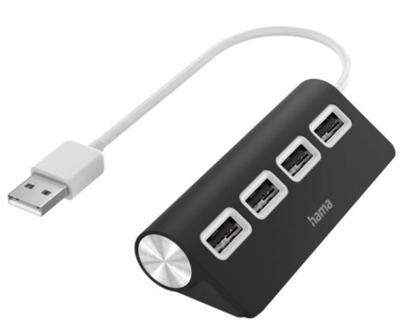 Hama USB-Hub, 4 Ports, USB 2.0 480 Mbit/s in schwarz, Plug & Play, keine manuelle Software-/Treiberinstallation erforderlich, Stromversorgung erfolgt über USB