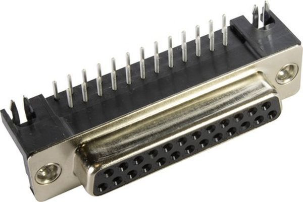 Steckverbinder, U.S. Footprint, Wellenlötanschluss, Bemessungsstrom: ?6,5 A, Buchse, Baugröße: D-Sub 3, Thermoplastischer Formstoff, glasfaserverstärkt (PBTP), Shell: Stahl, oberflächenveredelt, schwarz, Kontakte: 25 mit Massekontakt, Kupferlegierung, Edelmetall über Ni