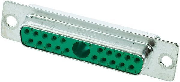 Steckverbinder, Lötkelchanschluss, Bemessungsstrom: ?5 A, Buchse, Baugröße: D-Sub 3, Thermoplastischer Formstoff, glasfaserverstärkt (Polyester), Shell: Stahl, verzinnt, grün, Kontakte: 21, Leiterquerschnitt: 0,5 mm², Kupferlegierung, Edelmetall über Ni
