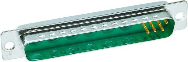 Steckverbinder, Lötkelchanschluss, Bemessungsstrom: ?5 A, Stift, Baugröße: D-Sub 4, Thermoplastischer Formstoff, glasfaserverstärkt (Polyester), Shell: Stahl, verzinnt, grün, Kontakte: 13, Leiterquerschnitt: 0,5 mm², Kupferlegierung, Edelmetall über Ni