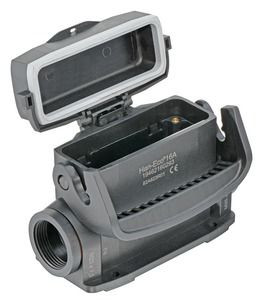 | Kurzbeschreibung | Sockelgehäuse, mit Kunststoffkappe, Baugröße: 16 A, Längsbügel, Polyamid (PA), glasfaserverstärkt, seitlicher Kabeleingang, 2x M25 |