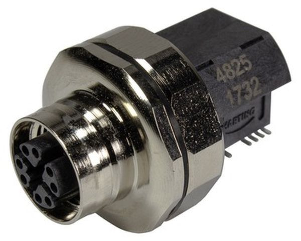 Leiterplattenadapter, mit integriertem Übertrager, gewinkelt, inkl. Flanschdose, Power over Ethernet (PoE+), für Frontmontage, Reflowlötanschluss (SMT), Bemessungsstrom: ?0,8 A, Kontakte: 8, Messing, Au über Ni steckseitig, Kodierung: X-Kodierung, Liquid-crystal polymer (LCP), schwarz