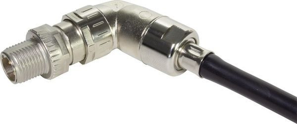 Kabelsteckverbinder, gewinkelt, Stift, D-Kodierung, Crimpanschluss, Liquid-crystal polymer (LCP), Kontakte: 4, Leiterquerschnitt: 0,12...0,82 mm², Bemessungsstrom: 4 A, Zink-Druckguss, Schraubverriegelung, Schutzart: IP65 / IP67 im gesteckten Zustand