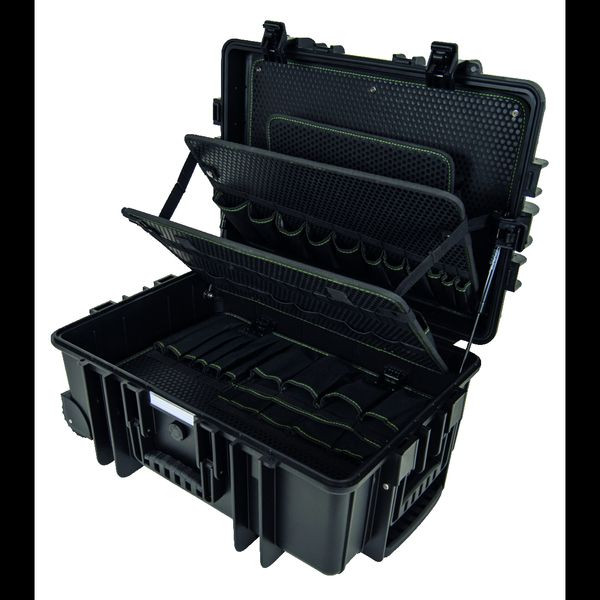 Geräumig und übersichtlich – der HAUPA Werkzeugtrolley HUPtransporter bietet viel Raum für Werkzeug Mit einer zusätzlichen Werkzeugtafel bietet der Werkzeugtrolley HUPtransporter besonders viel Platz für Werkzeug. Die Boards finden sich dabei übersichtlich angeordnet, sodass ein leichter Zugriff auf das Werkzeug jederzeit möglich ist. Stabile Pockets und Loops sorgen dafür, dass jedes Werkzeug zuverlässig an seinem zugewiesenen Platz bleibt, es sei denn, es wird benötigt. Inhalt: extrem stabiler Koffer: Gehäuse aus Polypropylen (PP) mit Gasdruckfeder flugtauglich: automatisches Luftdruckausgleichsventil stapelbar staubdicht vor Spritzwasser geschützt Temperaturstabil von -30 °C bis +80 °C ergonomischer Zwei-Komponentengriff Ösen für Vorhängeschloss Alu-Trennsteg-System Farbe: schwarz mit Eigentumskennzeichnung