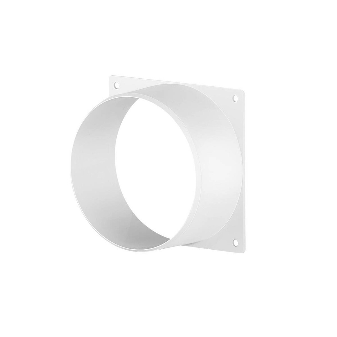Anschlussstutzen mit quadratischer Flanschplatte und rundem Stutzen, aus Kunststoff. Für den Anschluss von Rohren der NW 100 mm an plane Flächen.